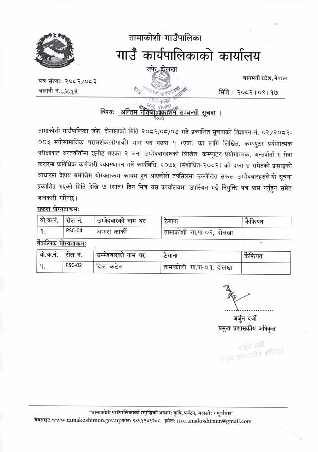अन्तिम नतिजा प्रकाशन सम्बन्धी सूचना - मनोसामाजिक परामर्शकर्ता