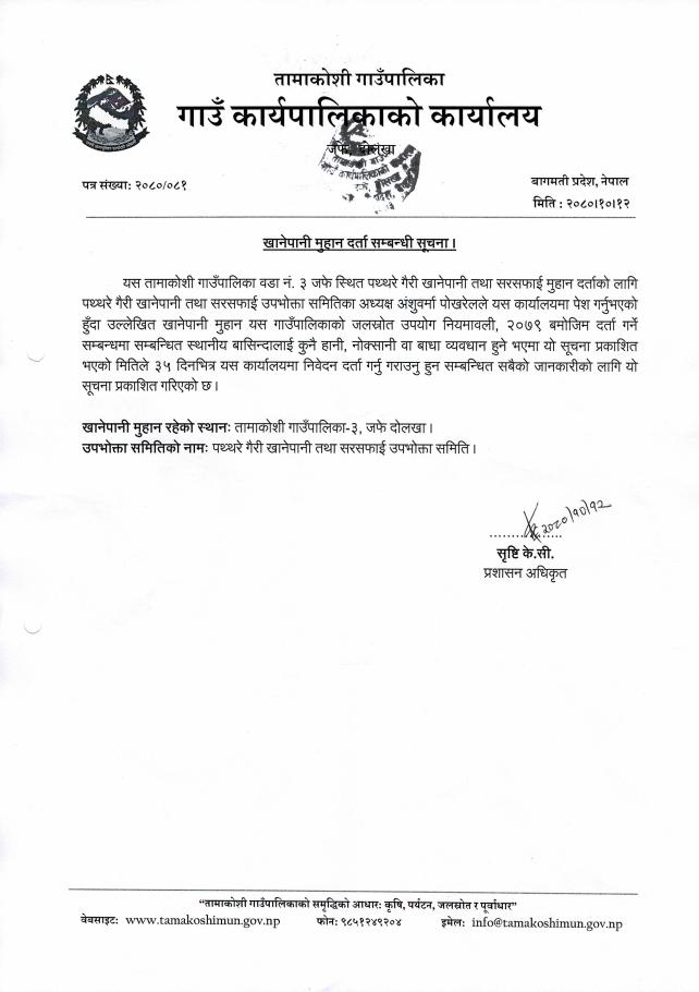 » खानेपानी मुहान दर्ता सम्बन्धी सूचना ।
