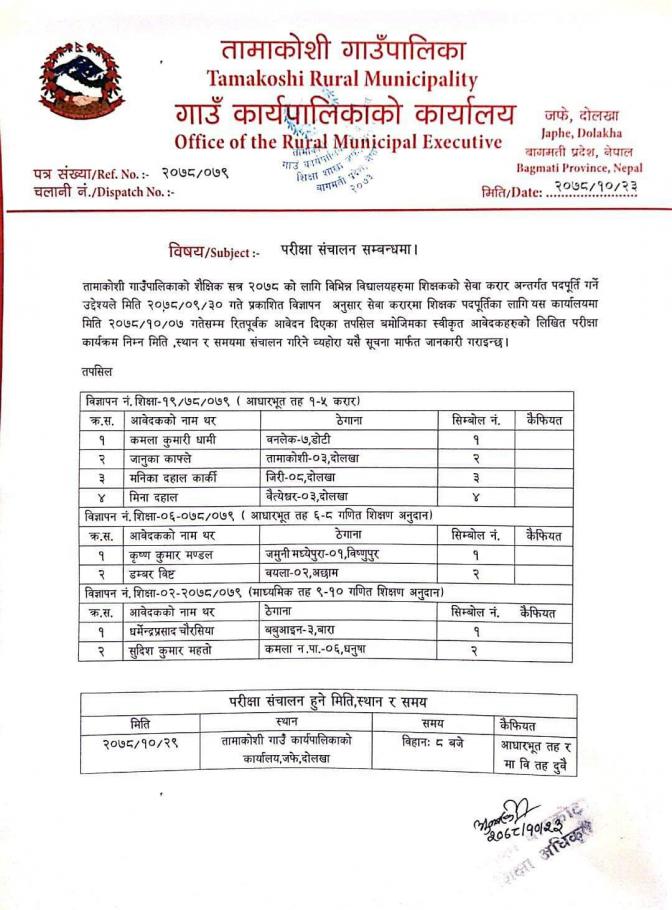 परीक्षा कार्यक्रम सञ्चालन सम्बन्धी सूचना ।