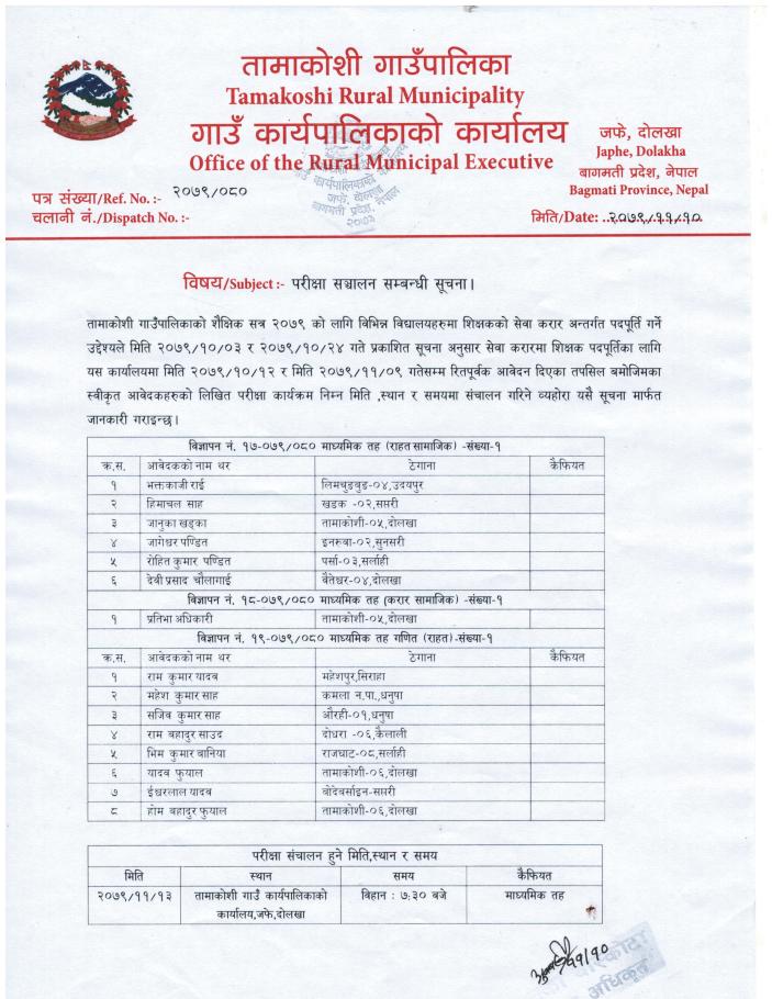 परीक्षा सञ्चालन सम्बन्धी सूचना ।