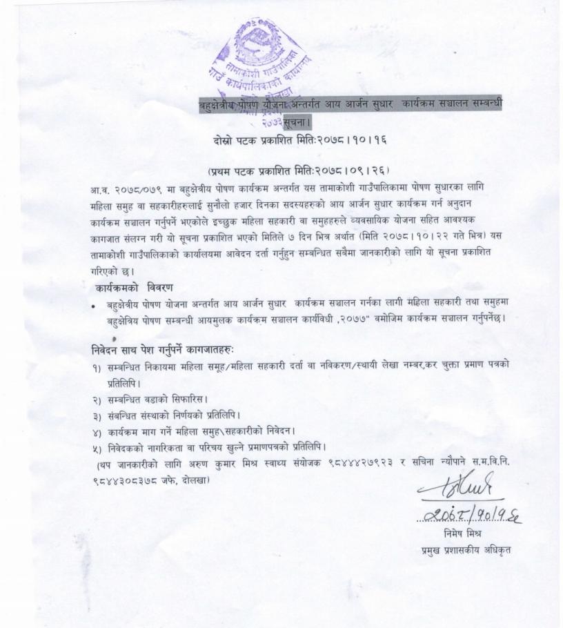 बहुक्षेत्रीय पोषण योजना अन्तरगत आयआर्जन सुधार कार्यक्रम सञ्चालन सम्बन्धी दोस्रोपटक प्रकाशित सूचना ।
