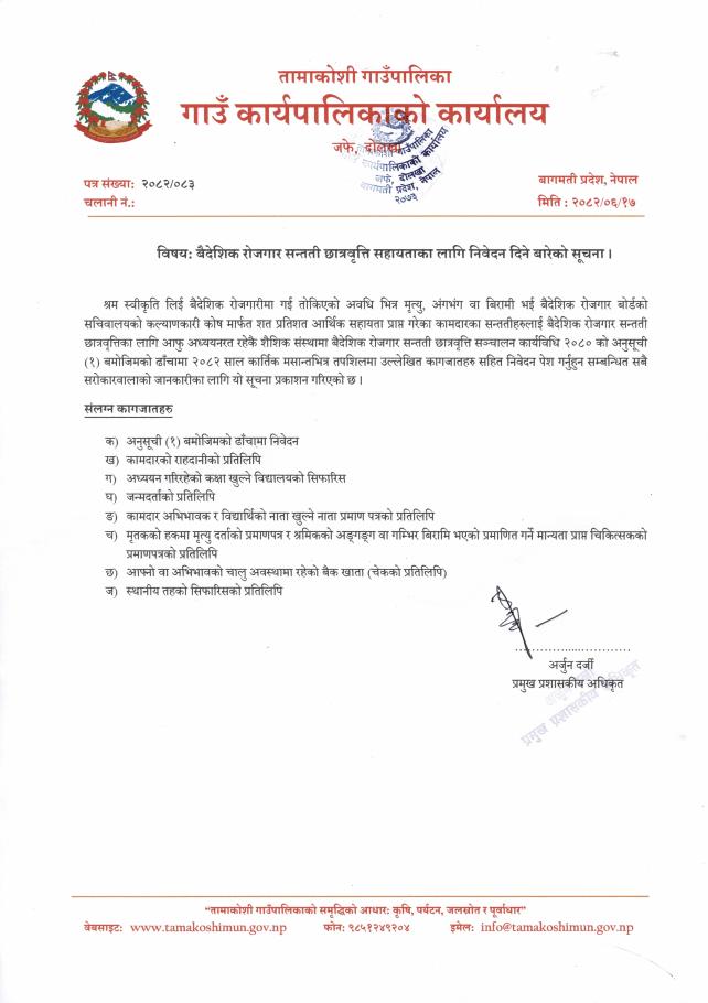 बैदेशिक रोजगार सन्तति छात्रबृति सहयताका लागि निवेदन दिने बारेको सूचना
