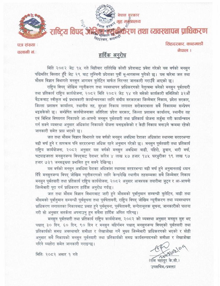 राष्ट्रिय विपद जोखिम न्यूनिकरण तथा व्यवस्थापन प्राधिकरणबाट मौशम सम्बन्धी सतर्कताका लागि सूचना ।