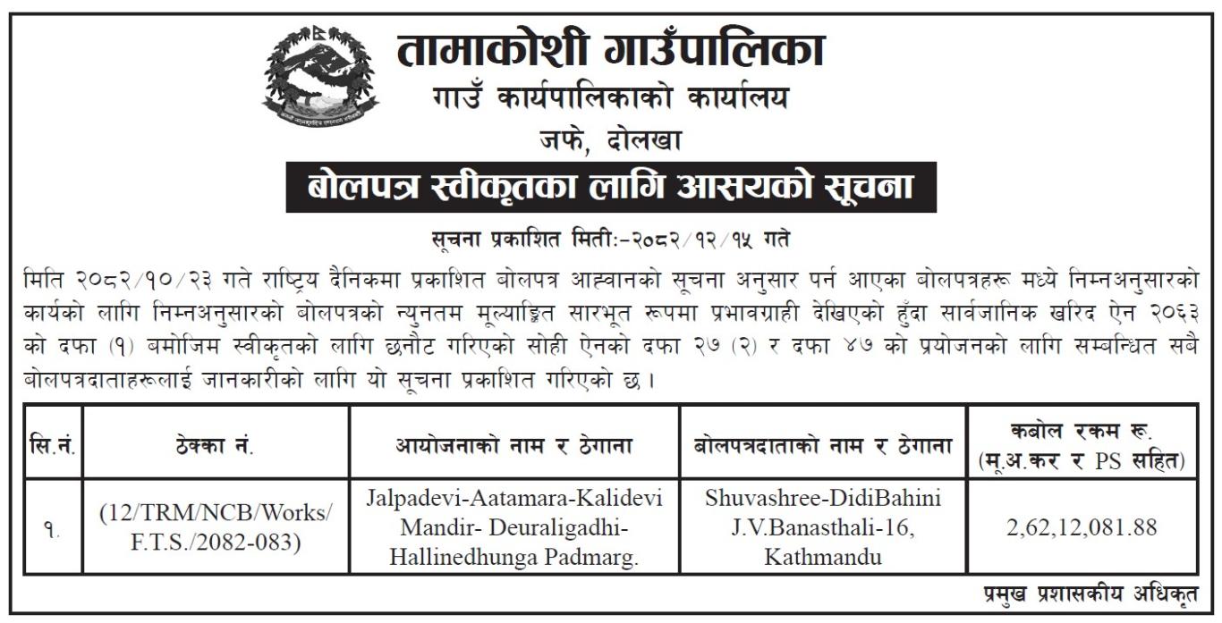 बोलपत्र स्वीकृत गर्ने आशयको सूचना ।