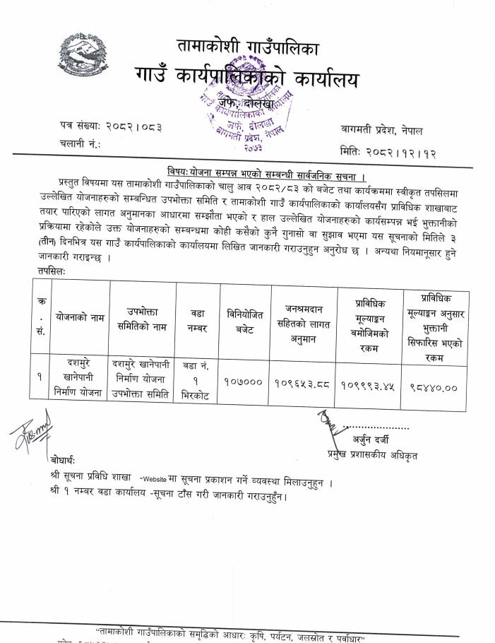 योजनाको कार्य सम्पन्न भएको सम्बन्धी सूचना - चैत १५