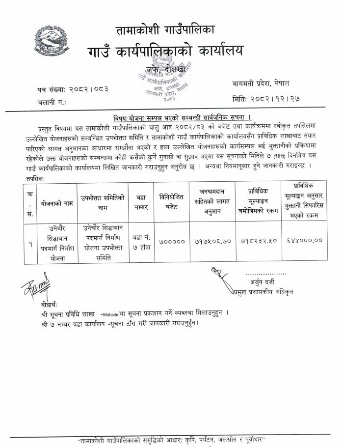 योजनाको कार्य सम्पन्न भएको सम्बन्धी सूचना - चैत १५