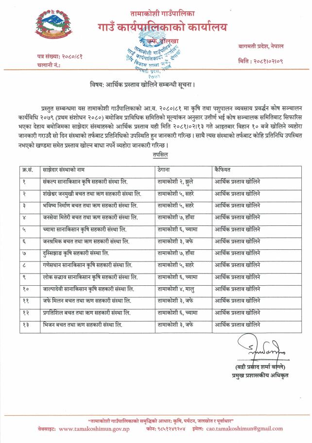 आर्थिक प्रस्ताव खोलिने सम्बन्धी सूचना ।