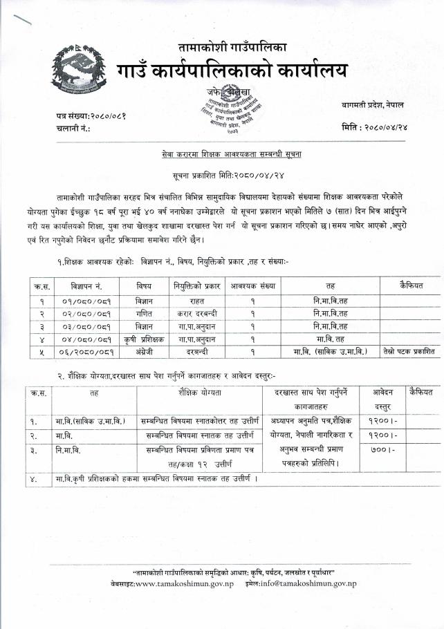 करार शिक्षक आवश्यकता सम्बन्धी सूचना ।