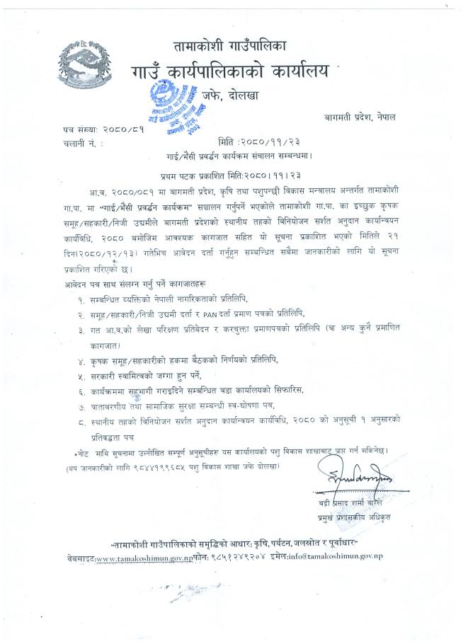 गाई/भैँसी प्रवर्द्धन कार्यक्रम सञ्चालन सम्बन्धी सूचना ।