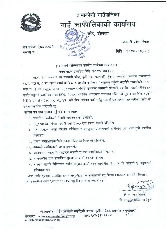» दुग्ध पदार्थ यान्त्रिकरण सहयोग कार्यक्रम सञ्चालन सम्बन्धी सूचना ।