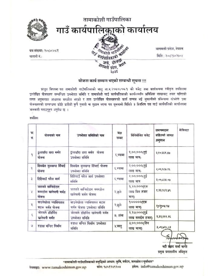 » योजनाको कार्य सम्पन्न भएको सम्बन्धी सूचना ।
