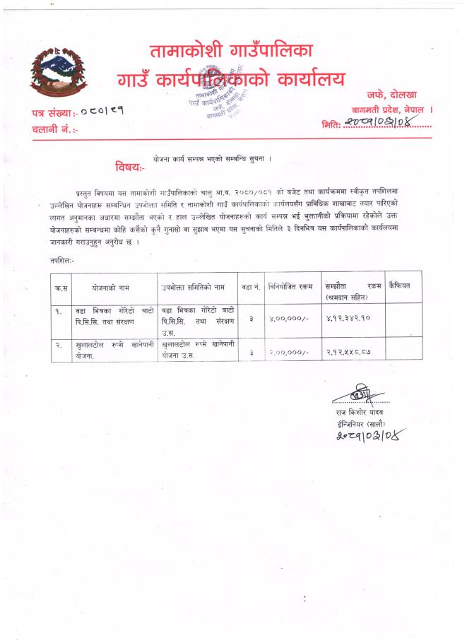 » योजनाको कार्य सम्पन्न भएको सम्बन्धी सूचना ।