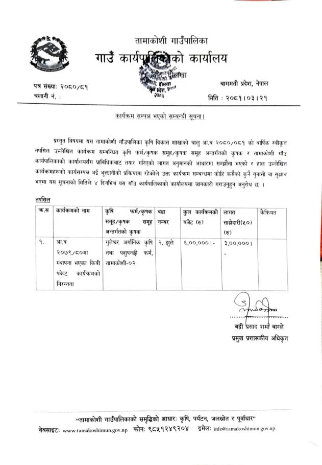 » योजनाको कार्य सम्पन्न भएको सम्बन्धी सूचना ।