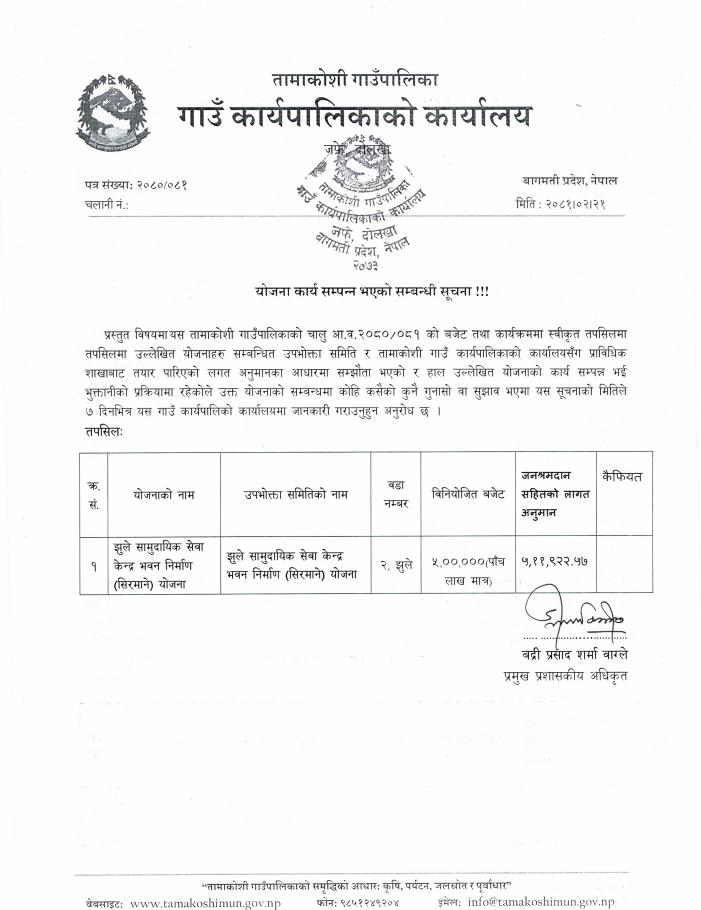 » योजनाको कार्य सम्पन्न भएको सम्बन्धी सूचना ।