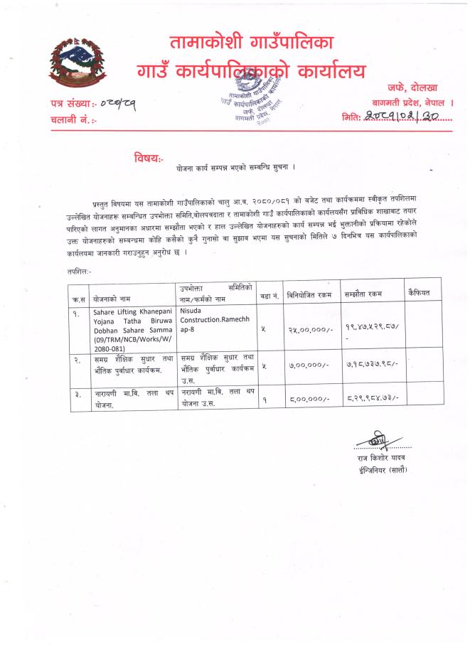 योजनाको कार्य सम्पन्न भएको सम्बन्धी सूचना ।