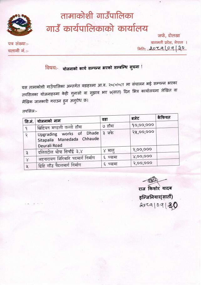 योजनाको कार्य सम्पन्न भएको सम्बन्धी सूचना (४) ।