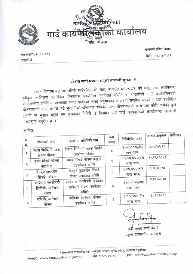 योजनाको कार्य सम्पन्न भएको सम्बन्धी सूचना (५) ।