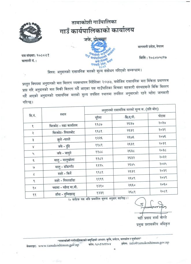 रासायनिक मलको मुल्य संशोधन गरिएको सम्बन्धमा ।