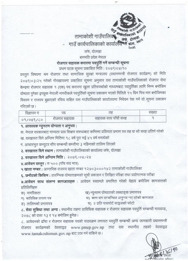 रोजगार सहायक करारमा पदपूर्ति गर्ने सम्बन्धी सूचना ।