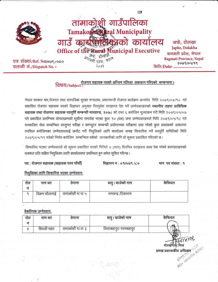 रोजगार सहायक पदको अन्तिम नतिजा प्रकाशन गरिएको सम्बन्धी सूचना ।