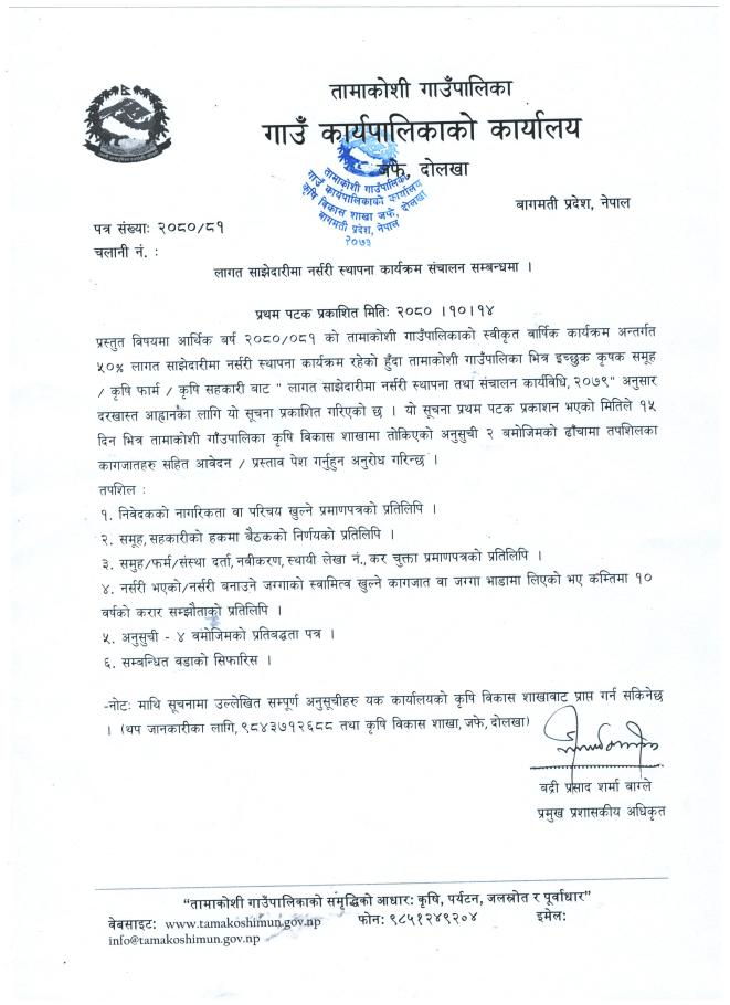 लागत साझेदारीमा नर्सरी स्थापना कार्यक्रम संचालन सम्बन्धमा ।