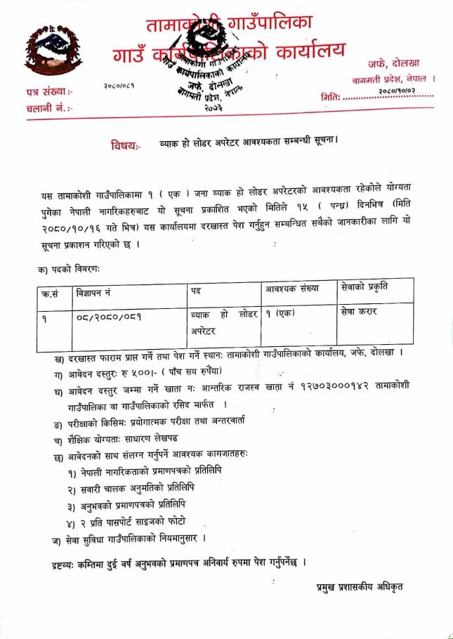 » व्याक हो लोडर अपरेटर आवश्यकता सम्बन्धी सूचना ।