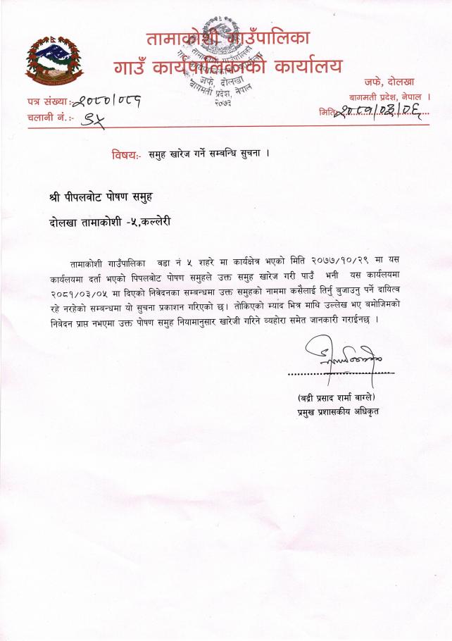 कृषक समूह खारेज गर्ने सम्बन्धी सूचना - पिपलबोट बाख्रापालन कृषक समूह ।