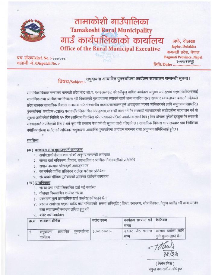 समूदायमा आधारित पुनर्स्थापना कार्यक्रम सञ्चालन सम्बन्धी सूचना ।