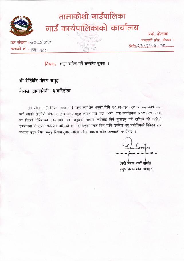 कृषक समूह खारेज गर्ने सम्बन्धी सूचना - पिपलबोट बाख्रापालन कृषक समूह ।