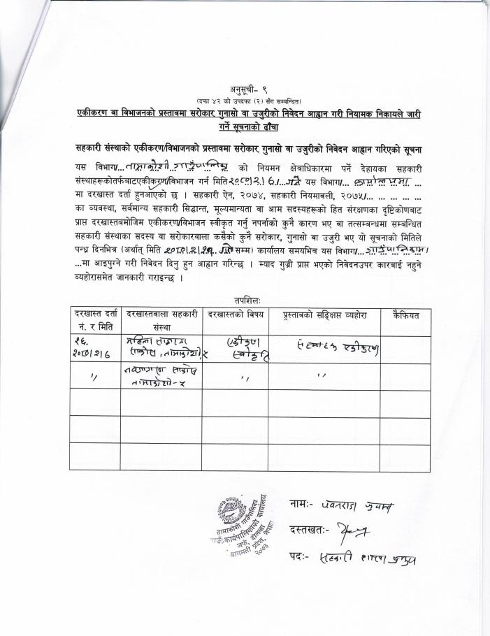 » सहकारी एकीकरणको प्रस्तावमा सरोकार, गुनासो वा उजुरी भएमा निवेदन दिने सम्बन्धी सम्बन्धित सबैको जानकारीको लागि सूचना ।