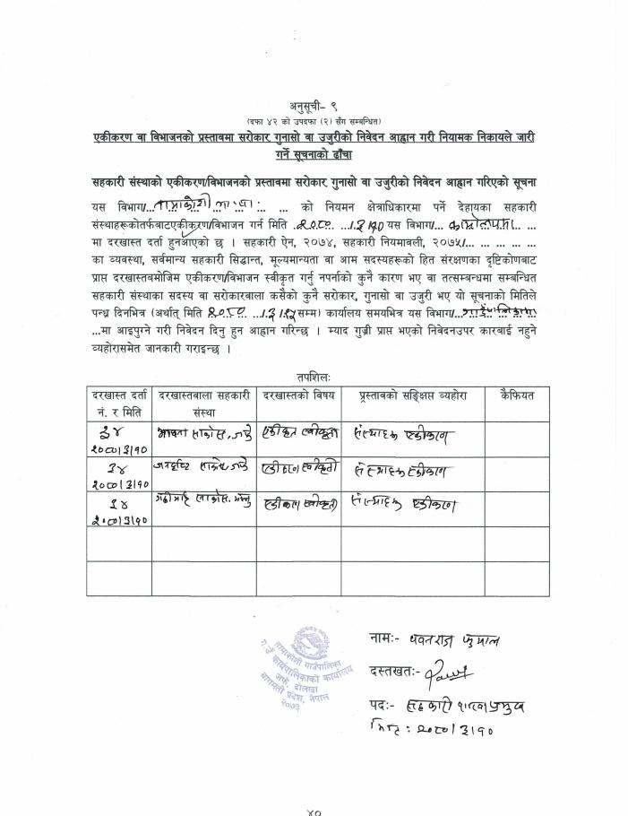 » सहकारी एकीकरणको प्रस्तावमा सरोकार, गुनासो वा उजुरी भएमा निवेदन दिने सम्बन्धी सम्बन्धित सबैको जानकारीको लागि सूचना ।