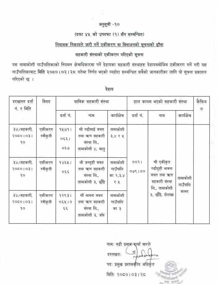 सहकारी संस्था एकीकरण गरिएको सूचना ।