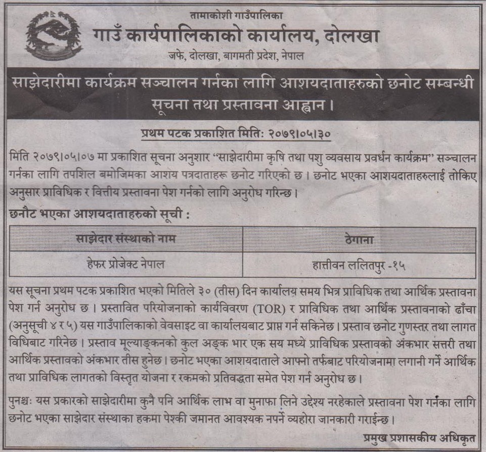 साझेदारीमा कार्यक्रम सञ्चालन गर्नका लागि आशयदाताहरुको छनौट तथा प्रस्ताव आव्हान सम्बन्धी सूचना ।