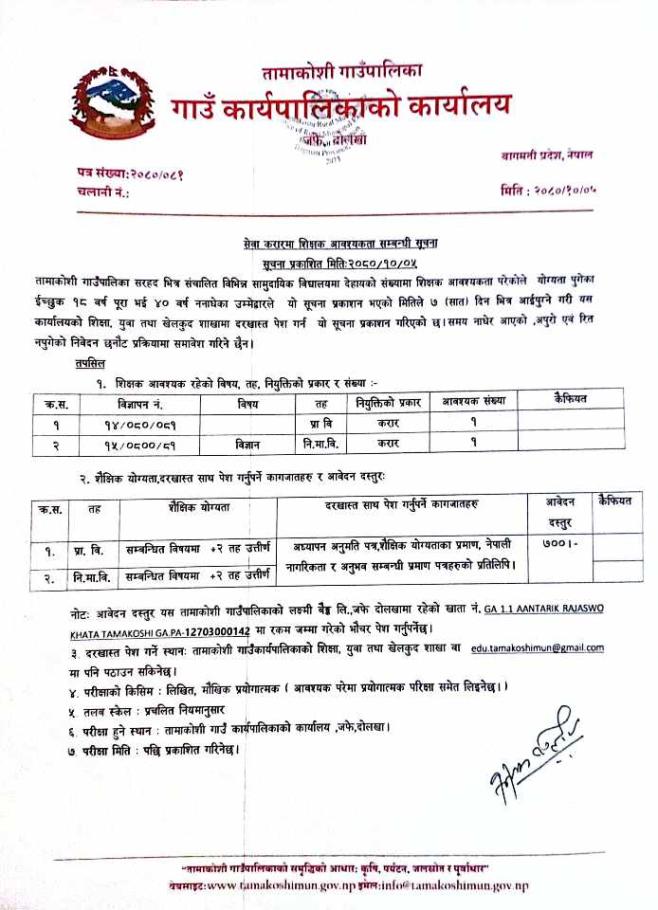 सेवा करारमा शिक्षक आवश्यकता सम्बन्धी सूचना (प्रा.वि., निमावि (विज्ञान)