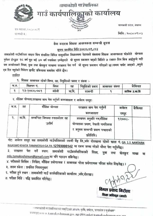 सेवा करारमा शिक्षक आवश्यकता सम्बन्धी सूचना ।