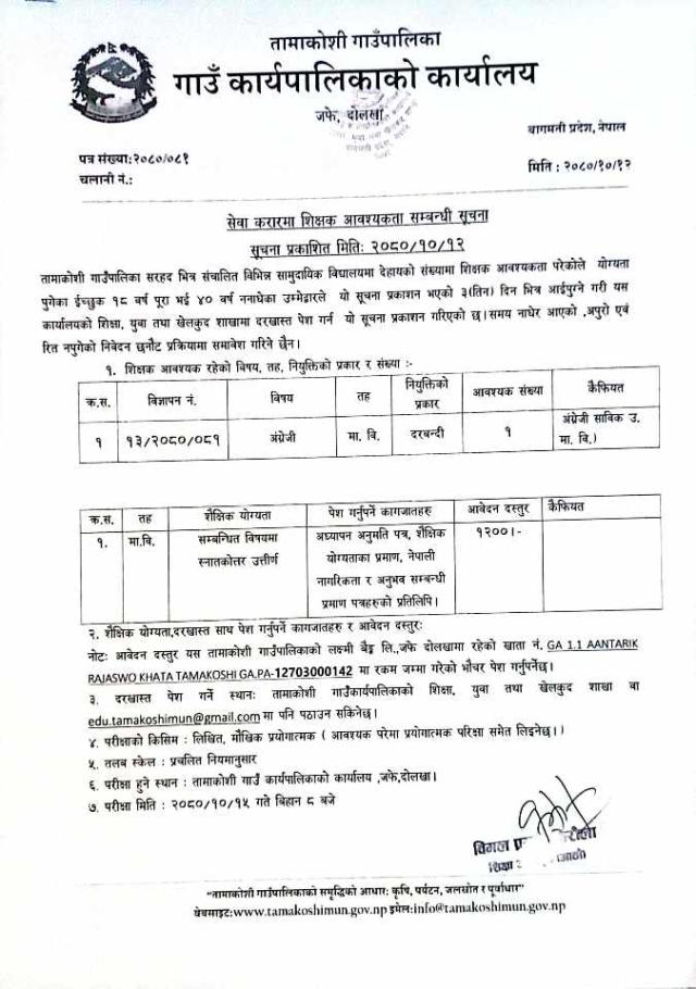 सेवा करारमा शिक्षक आवश्यकता सम्बन्धी सूचना ।