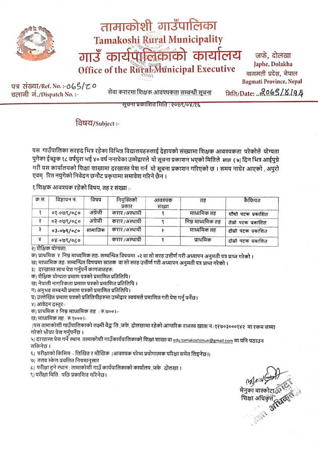 सेवा करारमा शिक्षक आवश्यकता सम्बन्धी सूचमा ।