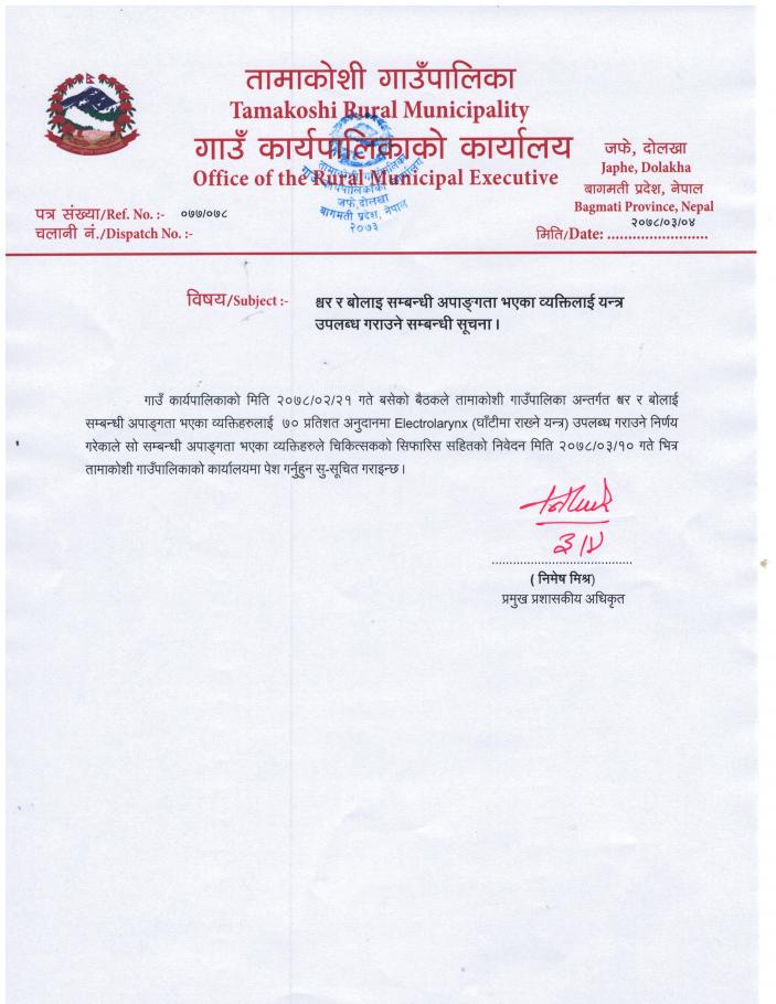 स्वर र बोलाई समबन्धी अपांगता भएका व्यक्तिलाई यन्त्र उपलब्ध गराउने सम्बन्धी सूचना ।