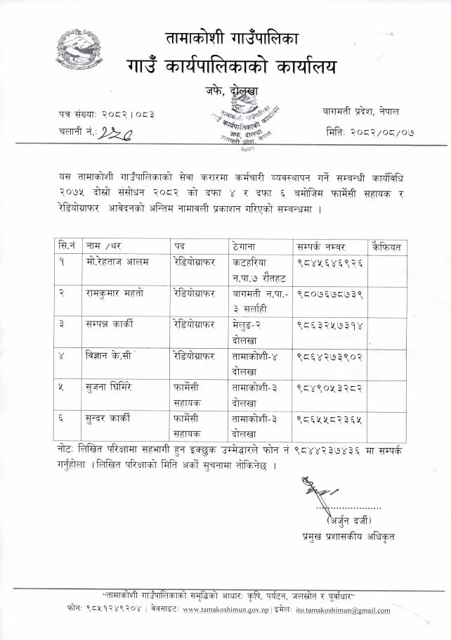 फार्मेसी सहायक र रेडियोग्राफर (सेवा करार) आवेदकहरुको अन्तिम नामावली प्रकाशन गरिएको सम्बन्धी सूचना