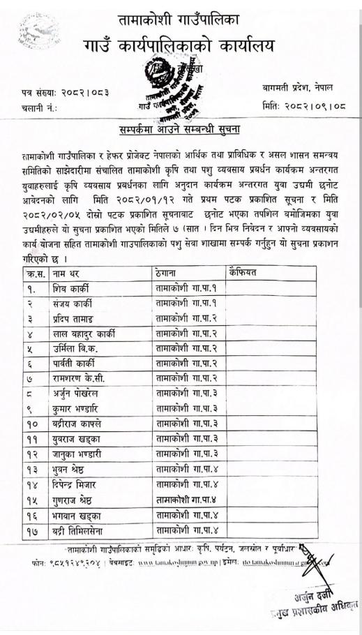 कृषि व्यवसाय प्रवर्द्धनका लागि अनुदान कार्यक्रममा छनौट भएका युवाहरु सम्पर्कमा आउने सम्बन्धी सूचना ।